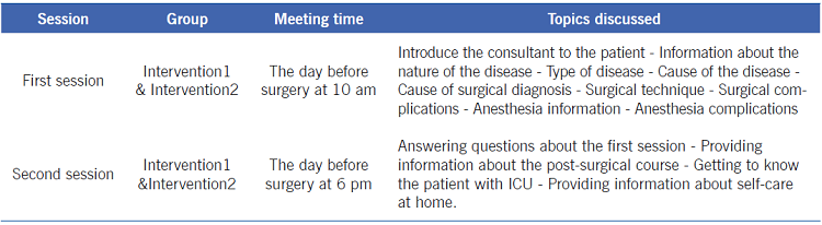 After consenting to the samples at the first visit and before any intervention, the patient completed a three-part questionnaire as a pre-test. The control group received only the routine counseling program that the ward provides for all patients, but intervention 1 and intervention 2 group’s in accordance with Table 1 received two one-hour counseling sessions in the day before surgery in addition to the routine counseling program. Counseling sessions were organized individually for each patient by the counselor, counseling sessions were held in the conference room of the ward, and the counselor, the patient and the experienced nurse were present at these sessions. At admission to the operating room, the control group and the intervention group 1 samples were admitted to the operating room according to the routine program of the hospital with a non-consultant in the operating room. But in order to admission Intervention Group 2 patients in operating room, they were accompanied by a consultant and patient transfer team from the ward to the operating room; consultant would admitted the patient in the operating room and perform the tasks performed on the patient's admission in the operating room; while waiting for anesthesia, the consultant stayed with the patient and acted as an emotional support and mentor in the operating room for the patient by benefiting from the positive interaction that was created during the two meetings with the patient. Then before receiving anesthesia, their vital signs and state anxiety were recorded as a post-test.