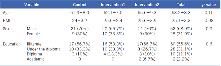 The results of this study showed that the mean age of the control, intervention 1 and intervention 2 groups were 61.9±8.02 years, 62.13±7.04 years, and 65.6±9.3 years, respectively and Mean BMI of the control, intervention 1 and intervention 2 groups were 24±3.2, 25.6±2.4 and 25.6±4 respectively In addition, no significant difference was observed in the age and BMI by the ANOVA test. Most of the patients in these three groups were male (68.9%) and most of the subjects were illiterate (55.6%) and the results of Chi-square test showed no significant difference between the three groups in terms of gender and education (Table 2).