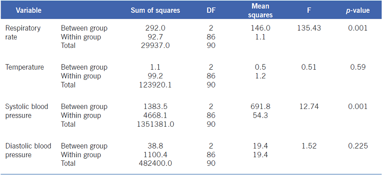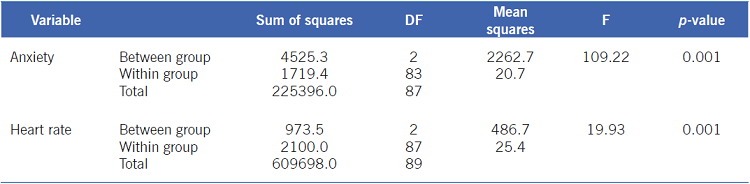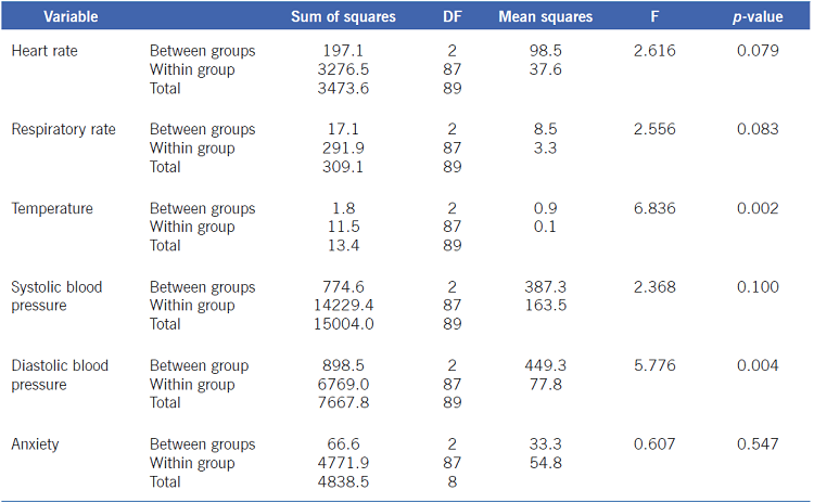 One-way covariance analysis test was used to compare the pre-test score of anxiety variables and vital signs. According to the results, the p-values in the pre-test of the variables of heart rate, respiratory rate, systolic blood pressure and positional anxiety showed no significant difference between the three groups. But for the variables of temperature and diastolic blood pressure were significant at the 0.05 level (Table 3).