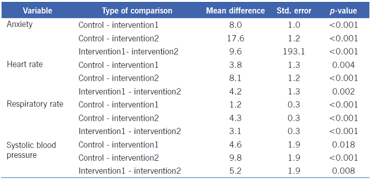 Between the mean of respiratory rate in the control group with intervention 1 and 2 groups (p<0.001) and also between the mean of respiratory rate in the intervention group 1 and intervention 2 group (p<0.001) there was a significant difference. It’s that the mean of respiratory rate in intervention 2 was lower than the control group and intervention 1. The mean of respiratory rate in intervention 1 group was lower than control group (Table 5). Between the mean of systolic blood pressure in the control group with intervention 1 (p=0.018), between the mean of systolic blood pressure in the control group with intervention 2 (p<0.001) and between the mean of systolic blood pressure in the intervention 1 group with intervention 2 (p=0.008) there was a significant difference that the mean of systolic blood pressure in intervention 2 was lower than the control group and intervention 1 and the mean of systolic blood pressure in intervention 1 group was lower than control group (Table 5).