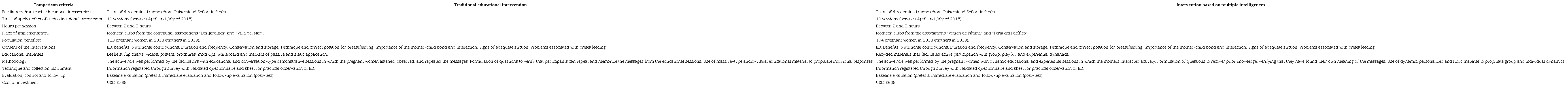 Specifically, for the cost-effectiveness evaluation, it was necessary to divide the investment cost of each of the two educational interventions into the number of mothers who improved their knowledge and practices of EB in each group, so that it was possible to obtain the cost per unit benefited. This comparison permitted knowing which of the interventions required less investment to achieve a greater number of beneficiary mothers, which permits deciding between two health programs with different educational methodologies if greater preventive effectiveness were sought on a target population with the most productive use of resources. Gathering of information with respect to knowledge and practices of EB required three moments: a baseline registry and of immediate results conducted between April and July of 2018 and, then the follow-up registry between April and July of 2019, that is, one year after having applied the interventions. These were carried out in 2018 by three nurses previously trained by an expert instructor on traditional educational methodologies and on multiple intelligences, whose characteristics are described in Table 1.