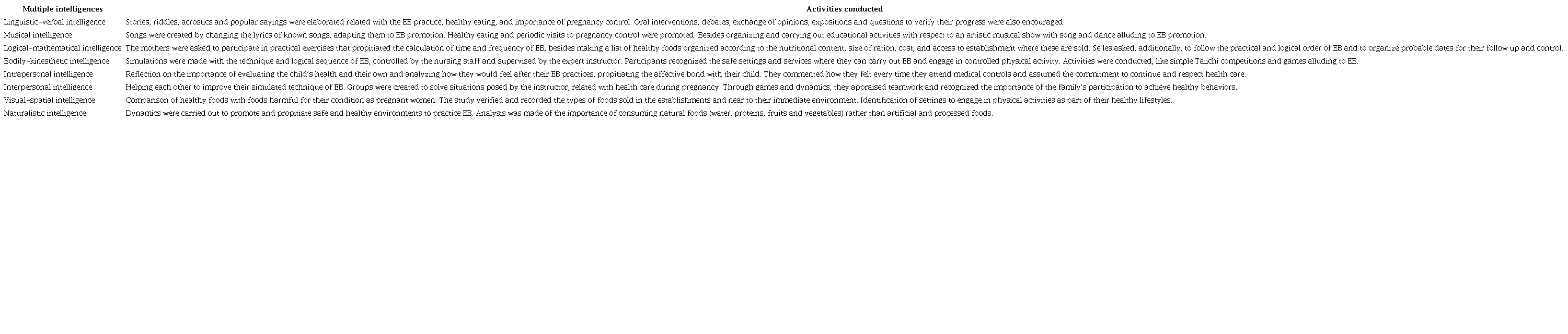 The traditional methodology is that which has been widely disseminated in the “Technical guide for advisory on maternal breastfeeding”, elaborated by the Health Promotion Direction of the Peruvian Ministry of Health.14 The multiple intelligences methodology is based on the theory by Howard Gardner, who held that human intelligence is not limited to their intellectual capacity, but to a set of abilities and skills organized into eight types of intelligences. Table 2 shows the activities performed within the framework of this methodology.