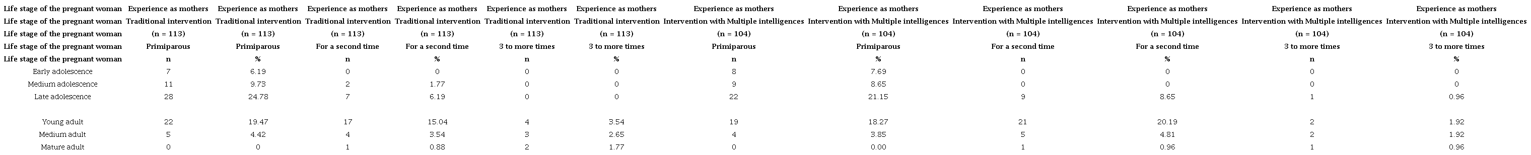 According with the information registries obtained from the mothers’ clubs from the Communal Associations in Pimentel, 11 were excluded because they were minors whose parents refused the informed consent, selecting 217 information registries of pregnant women. Table 3 shows the distribution of the women in the study according with their stage of life at the moment of the pregnancy, identifying that 48.67% of the pregnant women were adolescents and 51.33% of the pregnant women were adults who participated in the group of educational intervention with traditional methodology in comparison with 47.12% of the pregnant women in adolescent stage and 52.88% of the adult pregnant women from the group of intervention based on multiple intelligences. Moreover, according to their experience as mothers, it was evidenced that, in both educational intervention groups, there were primiparous mothers in higher percentage than women who mothers for the second or more times.