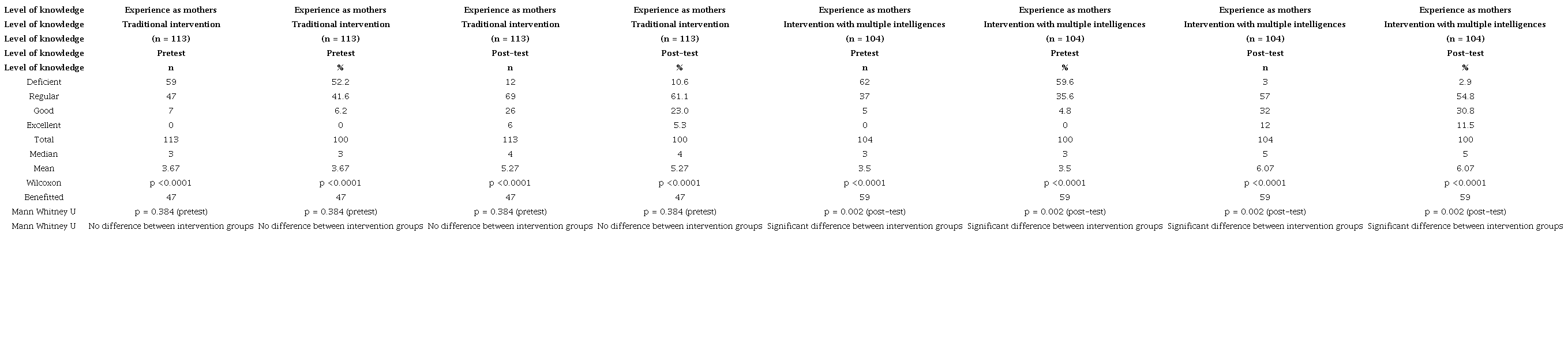 Methods: This is a retrospective, longitudinal descriptive study, which reviewed 113 information registries of mothers participating in a traditional educational intervention and 104 mothers with intervention based on multiple intelligences, evaluating the level of knowledge and exclusive maternal breastfeeding practices through observation visits.