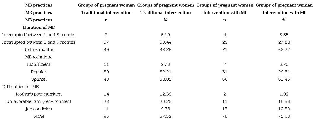 Regarding the mothers who benefitted with the best MB practices, Table 5 evidences that 68.27% of the mothers who participated in the intervention with multiple intelligences practiced EB from six to more months in comparison with 43.36% of the group with traditional intervention, finding a higher percentage of mothers with MB interrupted prior to six months in the latter group. Additionally, from this table it may be determined that 63.46% of the mothers in the group with multiple intelligences reached an optimal MB technique against 38.05% in the traditional group. Difficulties that propitiated interrupting EB, in both groups, were unfavorable family environment and, more frequently, job conditions and mothers’ poor nutrition.