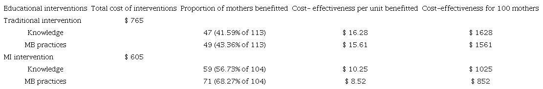 Resultados: A intervenção baseada em múltiplas inteligências obteve maior custo-efetividade do que a intervenção tradicional, pois com menor investimento conseguiu que 56.73% das mães aumentassem seus conhecimentos e 68.27% praticasse o aleitamento materno exclusivo por 6 meses ou mais, em comparação com a intervenção tradicional em que 41.59% e 43.36% melhoraram respectivamente; além disso, para sua aplicação efetiva a cada cem mães, seu investimento seria inferior ao do programa tradicional.