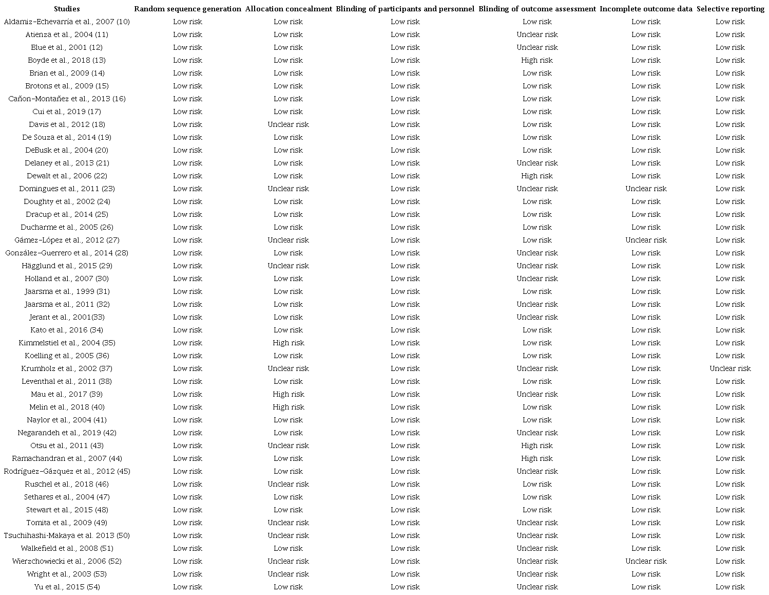 The evaluation of the risk of bias of the studies is presented in Table 2. According with the parameters evaluated by the RoB 1 tool,9) it was obtained that all the studies performed an adequate random sequence generation; allocation concealment was optimal in 65.1% of the studies included. Due to the nature of the educational interventions, in the studies it was not possible to conduct blinding of the patients and of the staff who offered the interventions. In relation blinding of outcome assessment, only 48.8% low risk was presented for this domain. In all, 93% of the studies described clearly the losses presented during the follow-up and if the data analysis was carried out through intention of treatment, which reduced the risk of bias due to incomplete results. Finally, regarding the risk of selective reporting of the results, it was found that 97.7% described the results proposed since the beginning (Table 2).