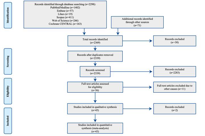 The work identified 2369 studies, of which 45 studies were included in the SR and data from 43 studies were included in the MA. Two studies were excluded from the MA because the data on readmissions corresponded to follow-up times different from the other studies and, hence, it was not possible to meta-analyze. The flow diagram for the selection and exclusion of studies is shown in Figure 1.