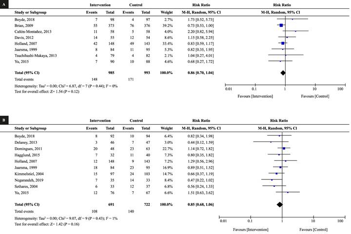 The MA of studies with follow-up at six months showed a 30% decrease in readmissions (RR: 0.70; 95% CI: 0.58 to 0.84; I2: 0%) and the 12-month follow-up evidenced 33% reduction (RR: 0.67; 95% CI: 0.58 to 0.76; I2: 52%); both analyses in favor of the group of educational interventions (Figure 3).