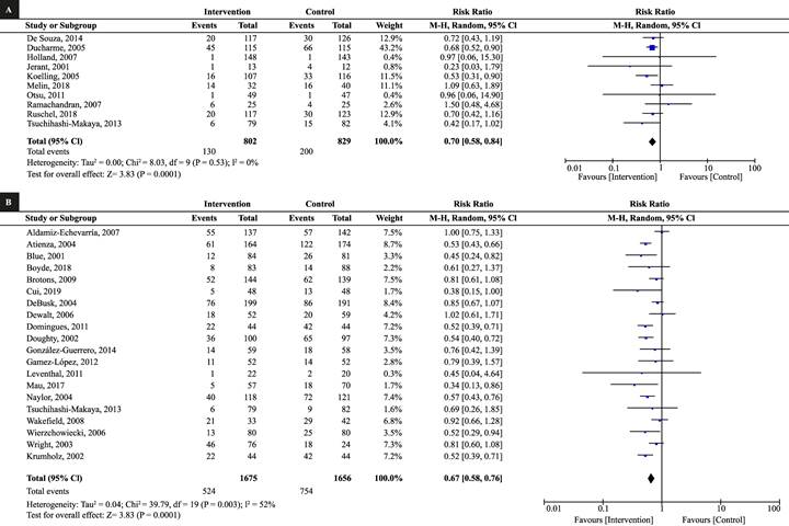 Methods: Systematic review (SR) and meta-analysis (MA) of randomized controlled trials that followed the recommendations of the PRISMA statement. The protocol was registered on PROSPERO (CRD42019139321). Searches were made from inception until July 2019 in the databases of PubMed/Medline, Embase, Cochrane CENTRAL, Lilacs, Web of Science, and Scopus. The MA was conducted through the random effects model. The effect measure used for the dichotomous outcomes was relative risk (RR) and for continuous outcomes the mean difference (MD) was used, with 95% confidence intervals (CI). Heterogeneity was evaluated through the inconsistency statistic (I2).