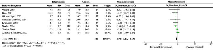 For the secondary outcome, days of hospital stay, no favorable effect was found of the educational interventions during the follow-up at three months (MD: -1.71; 95% CI: -3.87 to -0.46; I2: 0%) and six months (MD: 0.07; 95% CI: -1.33 to 1.45; I2: 0%). Nevertheless, the MA with follow-up at 12 months (Figure 4) evidenced a reduction of approximately two days in patients who received the educational interventions (MD: -1.98; 95% CI: -3.27 to -0.69; I2: 7%).