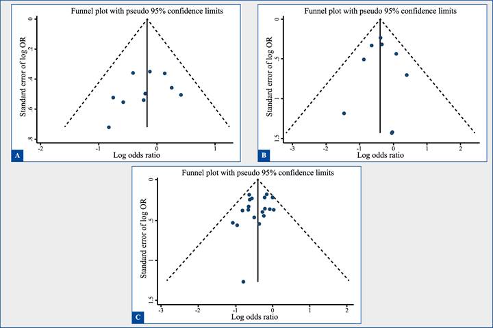 Figure 5 shows funnel plot graphics to evaluate publication bias under analysis of 10 or more studies (three months, six months, and twelve months of follow-up). For the three times of follow-up, it is possible to observe generally a funnel shape that indicates that the studies are distributed uniformly on both sides of the average, which suggests lack of publication bias. The Egger statistical test also indicated absence of publication bias (3 months, p = 0.30; 6 months, p = 0.87, and 12 months, p = 0.26).