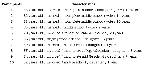 This cross-sectional study was developed following the guidelines of the clinical-qualitative method, which is intended to clarify experiences that concern the health-disease-care continuum from the perspective of patients, family members, or health workers.16 The sample was composed of 10 female family caregivers who met the following criteria: (1) were providing care for at least six months to a bedridden elderly patient with a chronic degenerative disease, and (2) were at least 18 years old.