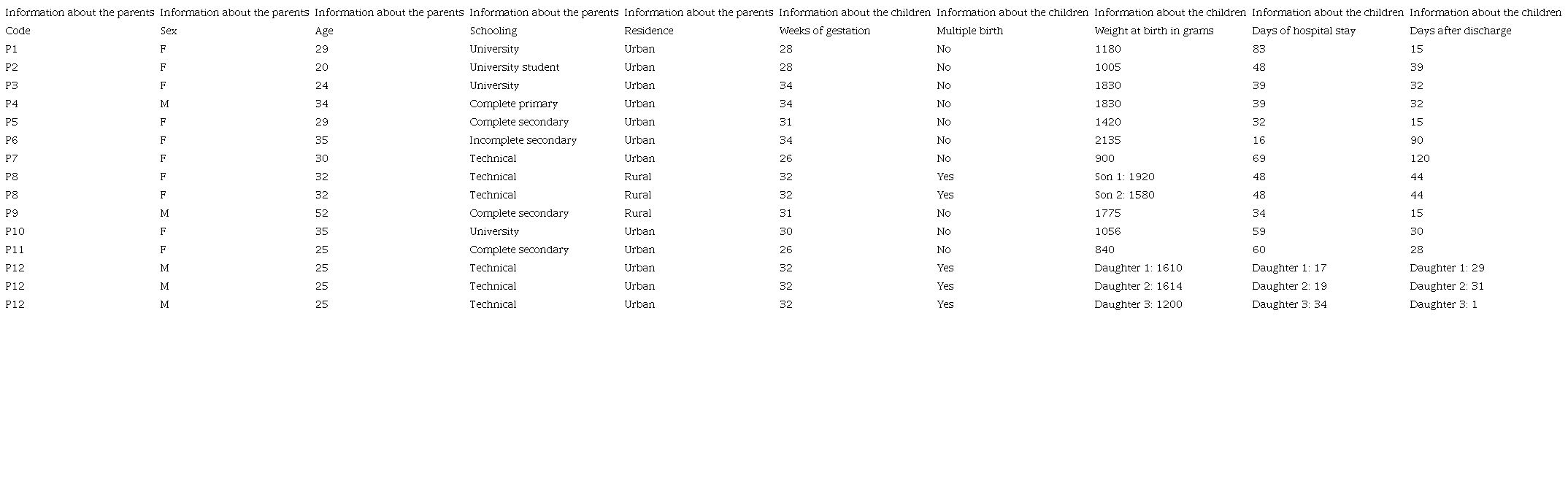 Twelve parents participated who had their children hospitalized in NICU during the pandemic, in different health institutions. The principal characteristics of the participants are shown in Table 1.