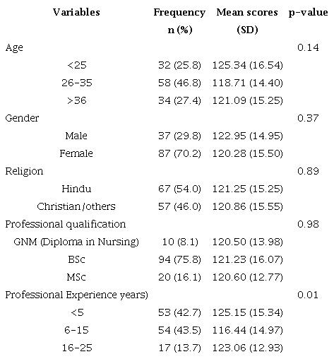 Métodos: Este é um estudo transversal de 124 enfermeiras selecionadas aleatoriamente que trabalham em um hospital terciário no sul da Índia. Os dados foram coletados por meio da Nursing Professional Values Scale (NPVS-3). Esse instrumento é composto por 28 itens com resposta do tipo Likert de 1 a 5 que avaliam os valores profissionais do enfermeiro em três domínios: cuidado (10 itens), ativismo (10 itens) e profissionalismo (8 itens). A faixa máxima de pontuação é de 28 a 140, quanto maior a pontuação, maior a orientação para os valores do profissional de enfermagem.