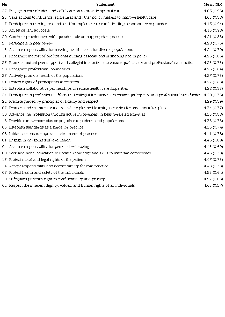 Conclusion: The present study showed that nurses have high professional and ethical values, although they perceive that the most important values are those related to direct patient care. Continuing education programs should be designed so that nurses understand that nonclinical professional values are also equally important in promoting the nursing profession.