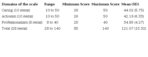 Results: The mean total score of the Professional Value scale was high (121.07±15.32). The mean score of the participants was higher in the caring domain (44.02±5.75) than activism (42.19±6.33) and professionalism domains (34.86±4.27). Pearson correlational analysis revealed that nurses with less experience had greater mean professional values score than nurses with higher experience (p<0.01).