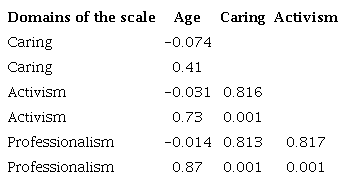 In this study, the mean professional value scores of age, gender, religion, and professional qualifications were not significantly different. However, a statistically significant difference observed between nurses’ professional experience and professional values scores. Nurses with less experience had greater mean professional values score than nurses with higher experience (p<0.01). Pearson’s correlational analysis revealed a positive relationship between caring, activism, and professionalism dimensions (p<0.001) (Table 4).