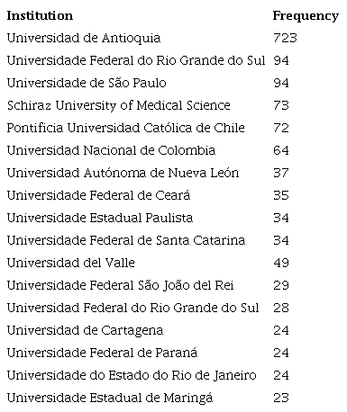 Table 1 shows the 18 most-frequent institutions related with the authors who publish in the Journal, with the first being Universidad de Antioquia, an expected condition, considering its shared origin. However, it is striking that, in order of production, international institutions appear above others from the national order. It can be seen in the case of Brazilian universities, like Universidade Federal do Rio Grande do Sul, with 94 articles and Universidade de São Paulo, with 92 articles. Likewise, other institutions, like Shiraz University of Medical Sciences, from Iran with 73 affiliations; and, lastly, Pontificia Universidad Católica in Chile with 72 affiliations identified. This could be interpreted in terms of the reach and the interest the Journal generates internationally and not only at the local and national levels.