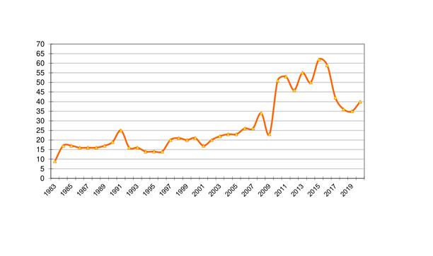 As observed in Graphic 1, the Journal has had stable behavior in recent years in the production of articles. It is striking that at no time has publication been stopped and, therefore, the Journal’s positioning has not been affected. During the last decade, growth in publications is notable due to the increase of a third number per year. However, although there is a decrease in the number of articles published in the last four years, this does not indicate difficulties in the editorial management process; on the contrary, it may be related with the reduction of articles per number for greater quality control and, thereby, a higher rejection rate for manuscripts received. This could be interpreted in terms of maturity and exigency of the editorial policies.