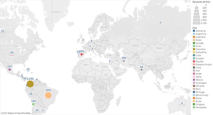 In relation to the authors’ origins, as shown in Figure 1, most publications have been from authors of Colombian nationality, followed by Brazilians, Mexicans, and Chileans; this could be translated into good regional visibility at Latin American level. Nevertheless, also striking is the number of authors from the European block, mainly Spain and Portugal; and from the Asian continent, especially from Iran and India. These data could be read as greater reach of visibility and interest in the Journal’s publication, which agrees with the analysis of institutional affiliation.