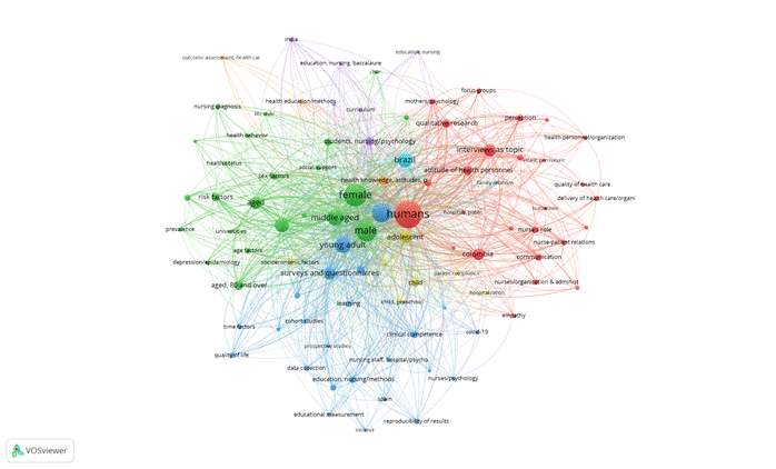 Specifically, the thematic cluster can be seen, corresponding to the term Humans; the size of the node shows the importance and recurrence of this concept in the Journal’s publications. The term presents a co-occurrence link with terms, such as qualitative research and analysis techniques associated with this type of research; this supposes that an interesting number of articles use this type of methodology. The relationship can also be seen of this concept with studies on the profile and role of nurses, showing permanent concern of the field for this topic of analysis. Evidence exists of studies that, within this framework, work the patient-nurse relation, communication, and some values with relation to humanism. In transversal manner, it could be understood that multiple related studies have focused on Colombia, which is consistent with the origin of the largest number of authors the Journal has had.