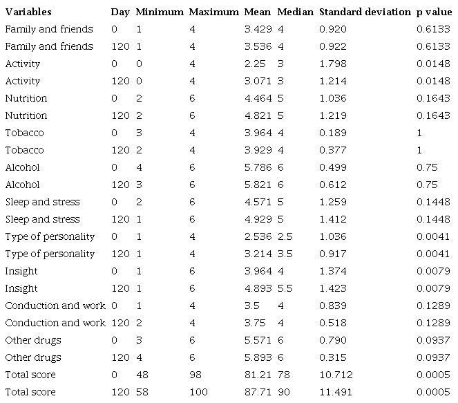 The statistical analysis used the R software and the exactRankTests library developed by Hothorn et al.,13 applying the Wilcoxon Signed Rank non-parametric test to measure the lifestyle change over time in the total score of the instrument and per domain, using 95% confidence interval.