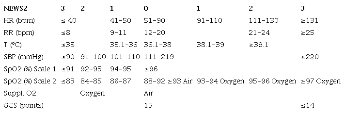 Scale 2 should be used in patients with hypercapnic respiratory failure to weigh up the oxygen saturation score. Each category was classified from zero to three points. The scores of each category were added together to obtain a total. Composite scores over five (or three in any of the parameters) triggered an urgent review. A score over seven triggered a review by the critical care team or an advanced medical response team. Abbreviations: NEWS2: National early warning score 2; HR: heart rate; RR: respiratory rate; T: temperature; SBP: systolic blood pressure; SpO2: oxygen saturation; suppl. O2: supplemental oxygen; GCS: Glasgow coma scale. Taken from the Royal College of Physicians.14