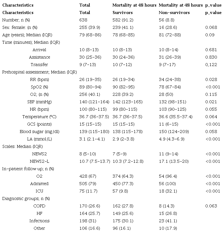 Methods: Prospective, multi-centre study of a cohort of 638 patients with dyspnoea treated in the ambulance and priority-transferred to a hospital emergency service in the cities of Valladolid, Salamanca, Segovia or Burgos (Spain). We collected clinical, analytical and demographic data. The main outcome measure was all-cause mortality within 48 hours. The recommendations of the Royal College of Physicians were followed to calculate NEWS2. When NEWS2 and LA prehospital values were obtained, the two values were added together to obtain the NEWS2-L.