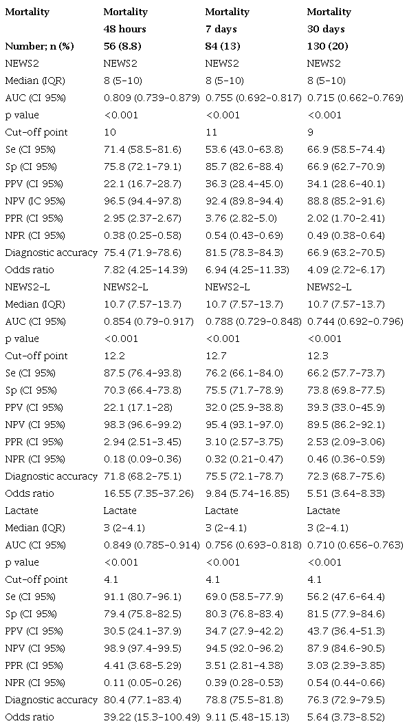 Results: Mortality within 48 hours was fifty-six patients (8.8%). The NEWS2-L scale obtained an area under the curve (AUC) of the receiver operating characteristics (ROC) for mortality within 48 hours of 0.854 (CI 95% 0.790-0.917), at seven days of 0.788 (CI 95% 0.729-0.848) and at 30 days of 0.744 (CI 95% 0.692-0.796); in all cases p<0.001, with a significant decrease between the value at 48 hours and at 30 days.