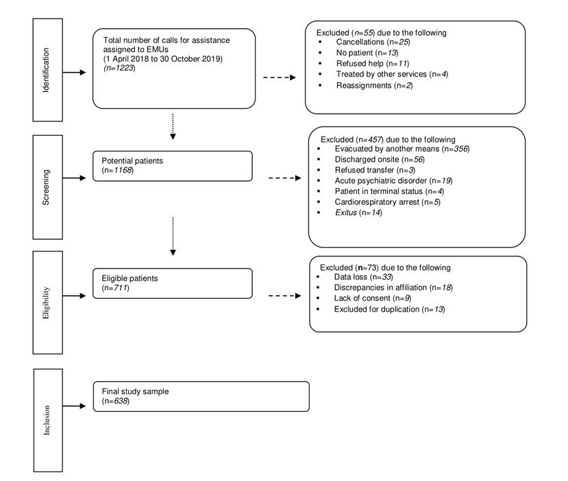 Participants. Between 1 April 2018 and 30 June 2019, patients aged ≥ 18 years were included if they had called the 112 emergency number requesting urgent help and after assessment by the ambulance (EMU) on the scene were determined to have dyspnoea (medical origin) as the reason for their call and were taken to their reference hospital by ambulance. Excluded from the study were patients where it was not possible to obtain informed consent, patients under the age of 18, pregnant women, patients with an acute psychiatric disorder or documented terminal disease, patients who died during the callout or transfer, patients evacuated by other means of transport (e.g., basic life support units or private means) or patients who following assessment by the EMU required no further urgent care and were discharged onsite.