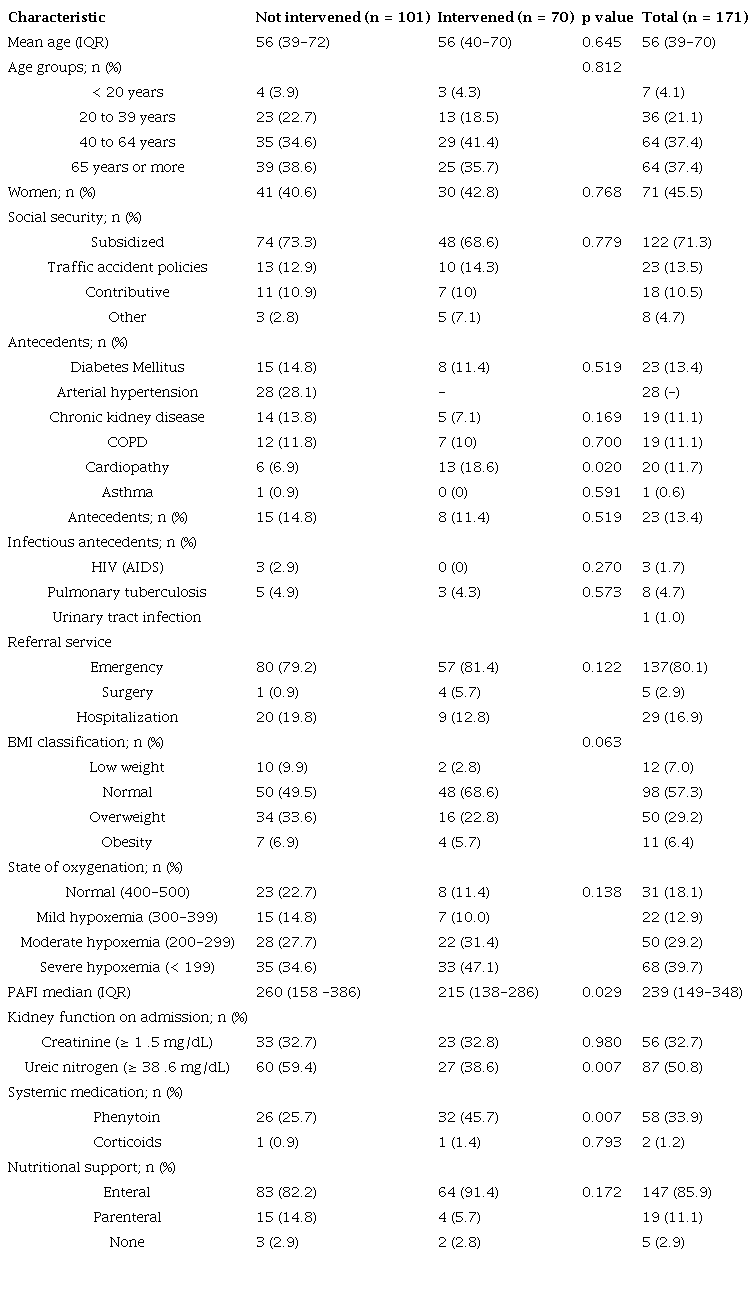 Data was collected from 171 patients, 70 (40.9%) of them seen after conducting the educational intervention. In total, 54% of the participants were men, with a mean age of 56 years for both groups; prevalence of patients affiliated to the subsidized scheme, without statistically significant differences. In the group intervened, higher prevalence was found of cardiopathy (p = 0.02), greater proportion of individual’s body mass index classified as normal (p = 0.06), greater PAFI median (p = 0.02), and greater use of phenytoin (p=0.007); moreover, lower frequency of high BUN was identified (p = 0.007). The other characteristics are described in Table 1.