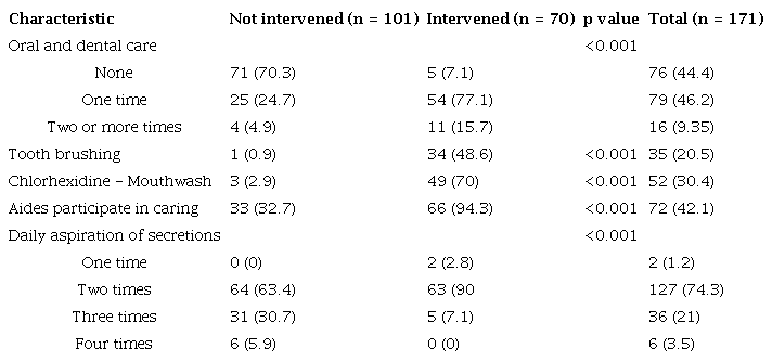 The record of activities with oral care rose from 29.6% to 92.8%, tooth brushing by patients was registered in 45.6% and application of chlorhexidine in 70% of patients seen after the intervention, with significant differences (p < 0.001) compared with patients before the intervention. Table 2 presents the variables referring to oral and dental care, like frequency of tooth brushing and use of chlorhexidine.