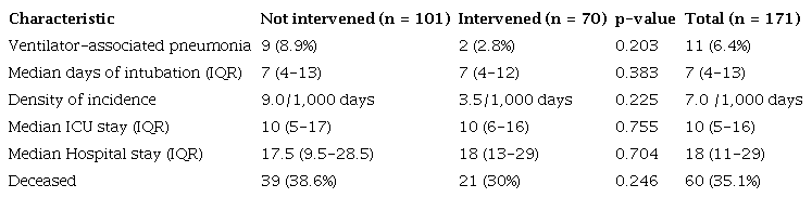Table 3 shows the description of other variables of interest and Table 4 details the results of the multivariate analysis. The accumulated VAP incidence diminished from 8.9% to 2.8% after the intervention and the rate dropped from 9 to 3.5 cases per 1000 days of intubation, both differences were not significant. The work estimated a decrease in mortality from 38.6% to 30% after the intervention, without statistical significance. All the VAP cases were classified as late (Table 3).