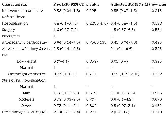 The multivariate model constructed with Poisson’s regression permits estimating 65% reduction of the incidence rate after the intervention adjusted by the referral service, antecedent of cardiopathy or chronic kidney disease, body mass index, PAFI classification, and ureic nitrogen (>20 mg/dL). This effect found showed no confidence intervals or statistically significant probability values.
