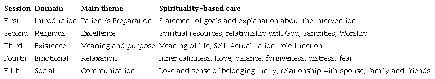 Intervention. Spiritual intervention was implemented based on a proposed protocol by Bussing et al.2 in four domains of religious (excellence), existence (meaning and purpose), emotional (relaxation) and social (communication). It was performed over five sessions before starting chemotherapy in the ward (Table 1). The duration of sessions varied from 30 to 50 minutes. The applied strategies in this intervention included interactive negotiation, mutual questioning and answering, short audio or video clips, book introduction, booklet, and expressing personal experience related to the above four domains. Intervention had been performed by the third author of this article who is a nurse with clinical experience working in oncology settings as well as with supporting of a spiritual counselor. The participants in the control group had received usual cares.