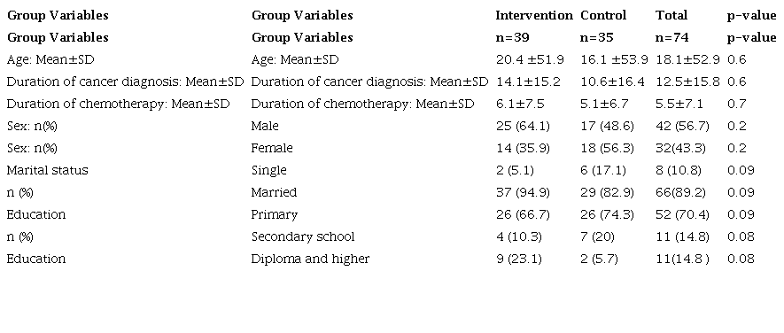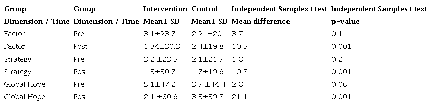 In the present study, 39 (52.7%) of 74 patients with cancer were in the intervention group and 35 patients (47.3%) were in the control group. The patients had a mean age of 52.9 years (SD=18.1) with (Range; 20-68 years old) (Table 2). The results of the study related to the scale of hope shows that there was no significant difference in mean scores of hope between the two groups in the pre- intervention assessment. However, in the post- intervention, Independent Samples t test for between group comparison indicates significant differences (p<0.001) in global mean scores of hope and also subscales of factor and strategy for the patients in the intervention group compared with the patients in the control group (Table 3). In addition, mean differences for global scores of hope (13.7), and sub-scales of factor (6.6) and strategy (7.2) are observed for the patients in the intervention group. These mean differences were statistically significant based on the results of Paired Samples t test (p<0.001).