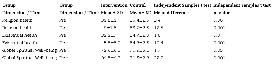 The results of the study related to the scale of spiritual well-being shows that there were no significant differences in mean scores of spiritual well-being between the two groups in the pre-intervention assessment. On contrast, our findings indicate significant differences for global mean scores of spiritual well-being and subscales of existence well-being, and religious well-being following spiritual intervention compared with the control group (table 4). The results of Paired Samples t test in within group comparison, presents statistical mean difference for global spiritual well-being (21.7), subscales of existential well-being (12.4) and religious well-being (9.2) for the patients in the intervention group, but no significant mean differences are observed for the patients in the control group.