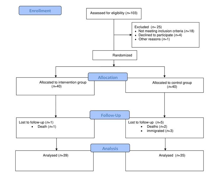 Design and Participants. This study is a randomized controlled trial research. The study population was patients with cancer referring to a single chemotherapy ward of Yasuj city, Iran, 2017-2018. One hundred and three patients were assessed for eligibility, however, 80 eligible patients were selected through non-random sampling method and then randomly assigned to one of the two groups of intervention (group A) or control (group B) using block randomization. At first, the groups of intervention and control was labeled with A and B letters, respectively. Next, two blocks namely; AB, BA was created based on the statistical factorial rule (2!: 2×1 =2) since we had two groups in this study. Therefore. We had two participants in each block in which their arrangement differed from each other. We selected blocks from these two blocks using replacement random sampling until the participants of our study were completed. Eighty eligible participants were assigned to one of these two groups (forty participants in each group). However, 74 patients completed this study (4 patients died and 2 patients were reluctant to continue the study). (Diagram 1). The blocked random allocation was designed by the first author, however, participants’ enrollment and assignment to one of the two groups was conducted by the second author of the article.