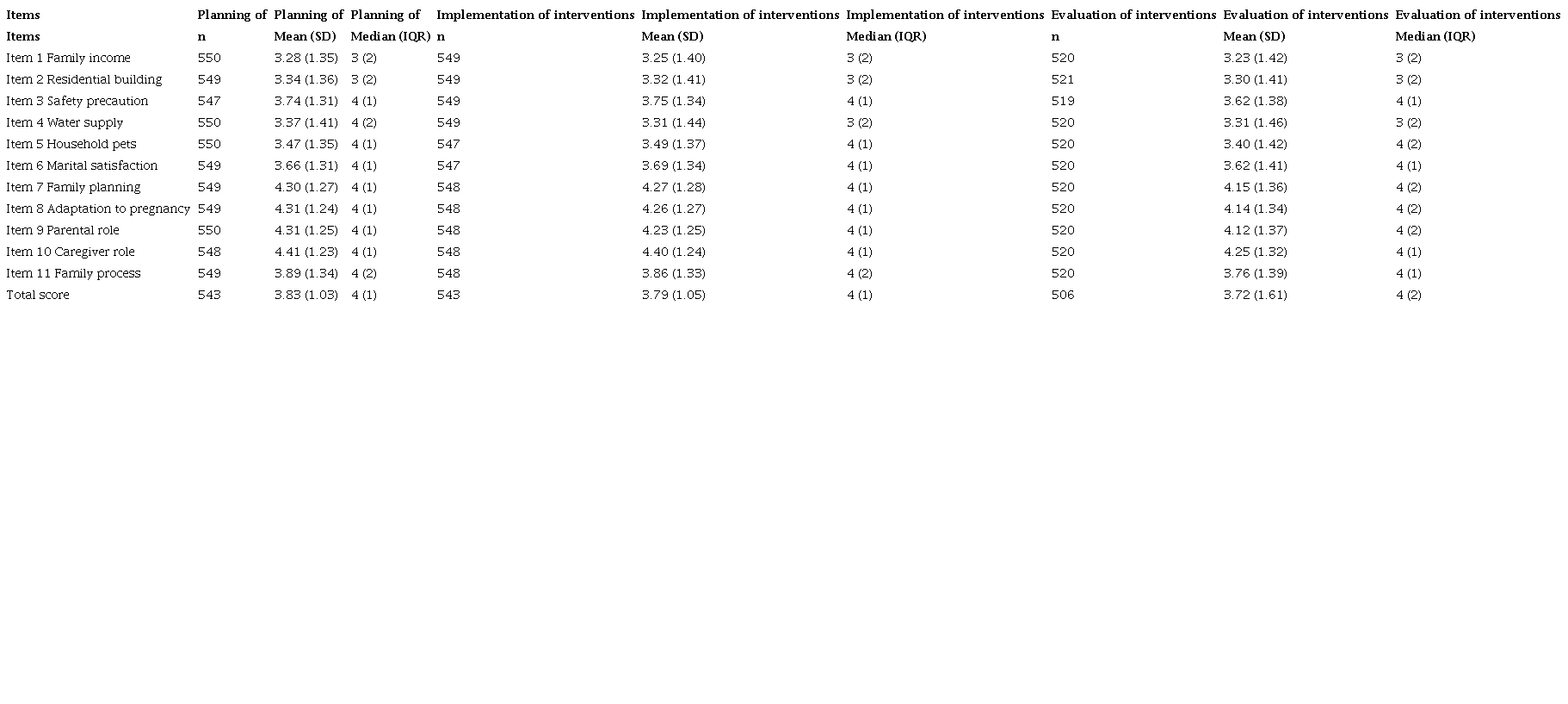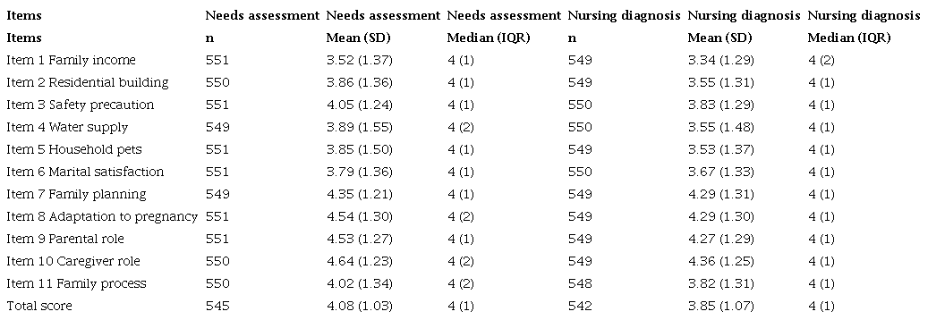 In relation to most items, participants perceived themselves as competent, whether in identifying needs or in stating the diagnosis, with mean values close to 4 on the Likert scale. According to Table 1, the lowest average value was found for family income, followed by marital satisfaction and water supply.