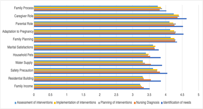 Figure 1 illustrates the mean distribution of participants' self-perception of competence in family assessment and intervention at all stages of the nursing process: needs assessment, diagnosis, planning of interventions, implementation of interventions, and evaluation of interventions.