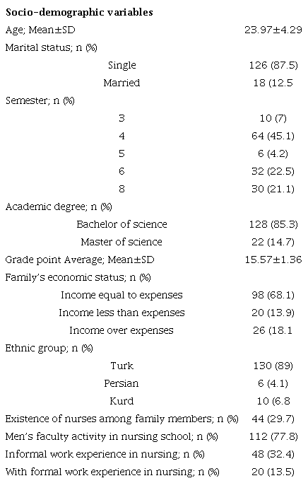 Participants. The research population included all male B.Sc. nursing students at the end of the second year to the fourth year of education (n=128) and all male M.Sc. nursing students at the end of the first and second year of education (n=22) in Tabriz School of Nursing and Midwifery. The study sample size was determined based on a pilot study. The participants included 150 nursing students selected through convenience sampling. The inclusion criteria of the study were being willing to take part in the research, being a B.Sc. or M.Sc. student, being a student at Tabriz University of Medical Sciences, and not being a guest or transfer student.