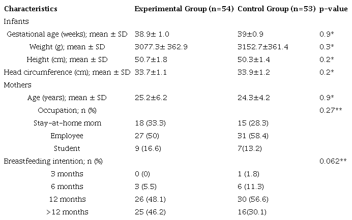 The analysis was performed with 107 mother-infant dyads (EG: 54 vs. CG: 53). Baseline data do not represent statistically significant differences between groups.