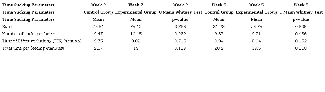 Table 3 shows the description of SE. There are no statistically significant differences between the EG and the CG. However, the results support the theory that ATVV stimulation promotes sucking development since there is a lower number of bursts, a higher number of sucks per burst, and a shorter sucking time in the EG than in the CG. This is a clinically meaningful result even though it is not statistically significant. These findings suggest that ATVV stimulation may increase muscle strength during sucking (not measured in this study), which allows for greater milk expression per minute. When comparing between groups the amount of breast milk expressed at week 2, it is observed that EG babies manage to express 2.02cc/TES more than CG babies (EG: 7.19 cc /TES vs. CG: 5.17 cc/TES, Mann-Whitney U-test p=0.002). At week 5, EG babies got 5.51 cc/TES more than CG babies (EG: 14.19 cc/TES vs. CG: 8.67 cc/TES, Mann-Whitney U-test p=0.002).