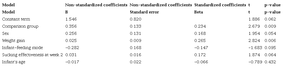 In the analysis of related samples, the Wilcoxon sign test showed statistically significant differences in both groups considering that time matures neonatal sucking ability. However, the benefits of ATVV stimulation are not unimportant, as seen in the regression model. A linear regression model was used and had an R-Squared of 0.336. Transformation of the dependent variable (SE) was necessary using the natural logarithm function to normalize the data distribution, a transformation that was verified using the Kolmogorov Smirnov test (p=0.200). Assessing the overall relevance of the model, its value p<0.001 allows us to affirm that the joint presence of the variables is relevant and, therefore, individual analysis of them is pertinent. In this sense, belonging to the EG and being a girl increase the natural logarithm of SE, while predominant breastfeeding decreases it. SE at week 2, weight gain, and neonatal age directly correlate with SE at week 5. These results confirm the importance of stimulating effective sucking early, as it can influence the feeding process in the long term; the use of breast milk substitutes can hinder SE. Other variables such as mode of birth, GA, birth weight, Apgar test score, use of epidural analgesia, or breastfeeding intention were removed from the model because they were not statistically significant (Table 3).