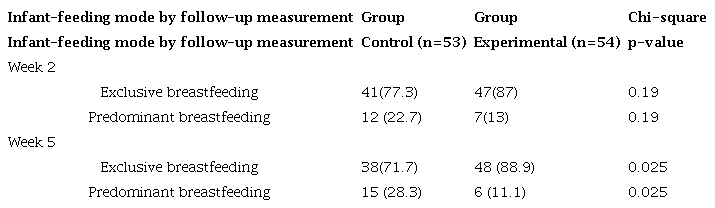 Regarding the feeding mode, a higher frequency of exclusive breastfeeding was observed in the EG dyads, a difference that is only statistically significant at the follow-up measurement at week 5. The achievement of effective sucking in the EG infants possibly improved mothers’ confidence in their ability to breastfeed, and for this reason, they return to exclusive breastfeeding (Table 4).