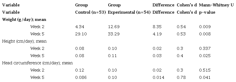 Resultados.: Os bebês do grupo experimental comparados com o grupo de controle beberam 2.02 cc mais leite humana num minuto de lactância efetiva (p=0.002) na segunda semana e 5.51 cc mais na quinta semana (p<0.0001); as mães registraram uma maior aderência à lactância às 5 semanas (p=0.025) e os bebês ganharam mais peso: 8.35 gramas/dia (p=0.009) e 4.19 gramas/dia (p=0.008). O perímetro cefálico não apresentou diferenças entre grupos, enquanto a diferença no tamanho foi estatisticamente significativa na 5ª semana (p=0.025).