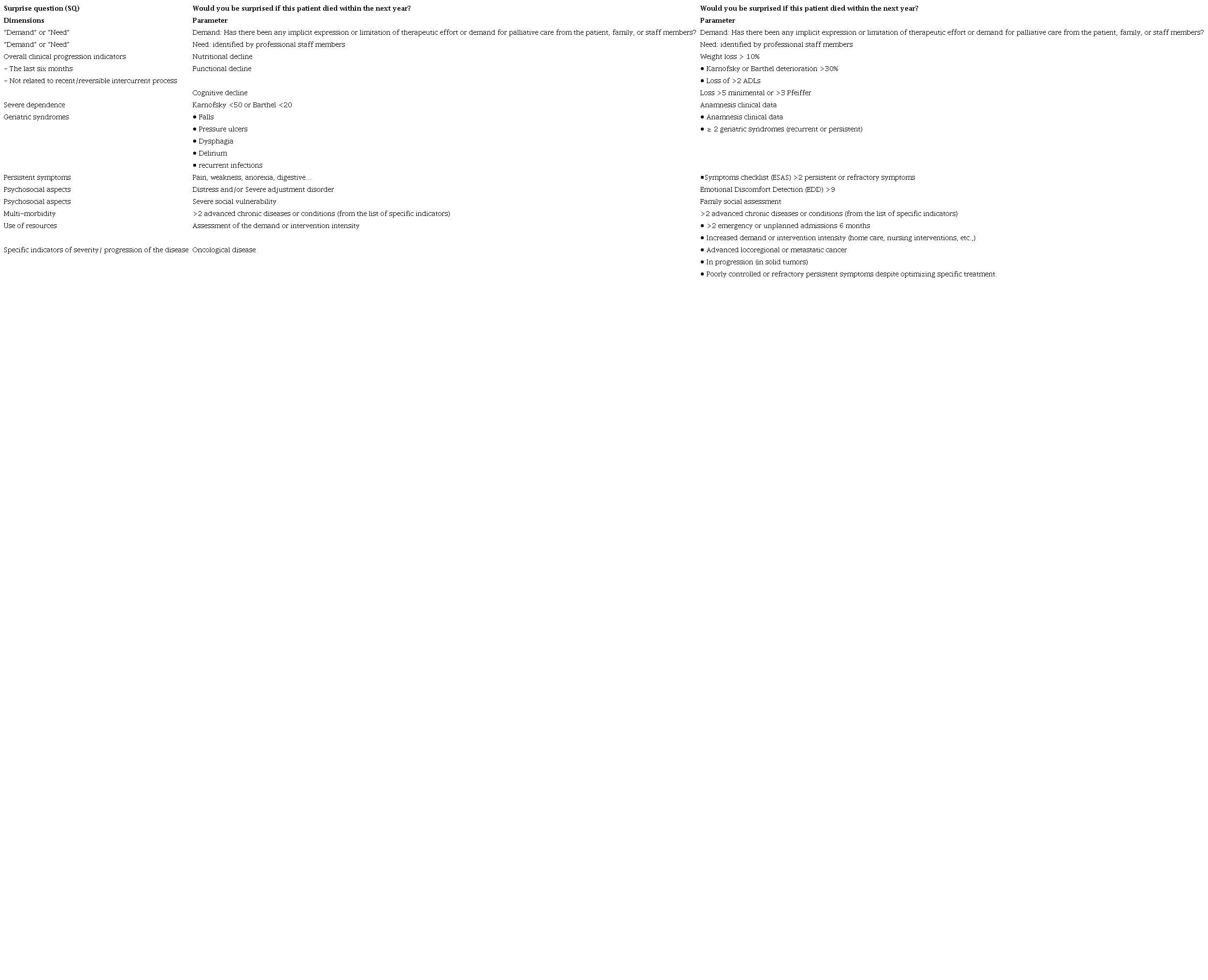 The dimension of geriatric syndromes was not kept in mind because it was not applicable to the target population in this study and only included specific severity or progression indicators related with oncological disease, so that, in addition to the surprise question (SQ), the remaining parameters shown in Table 1 were submitted to the content validation process by experts.