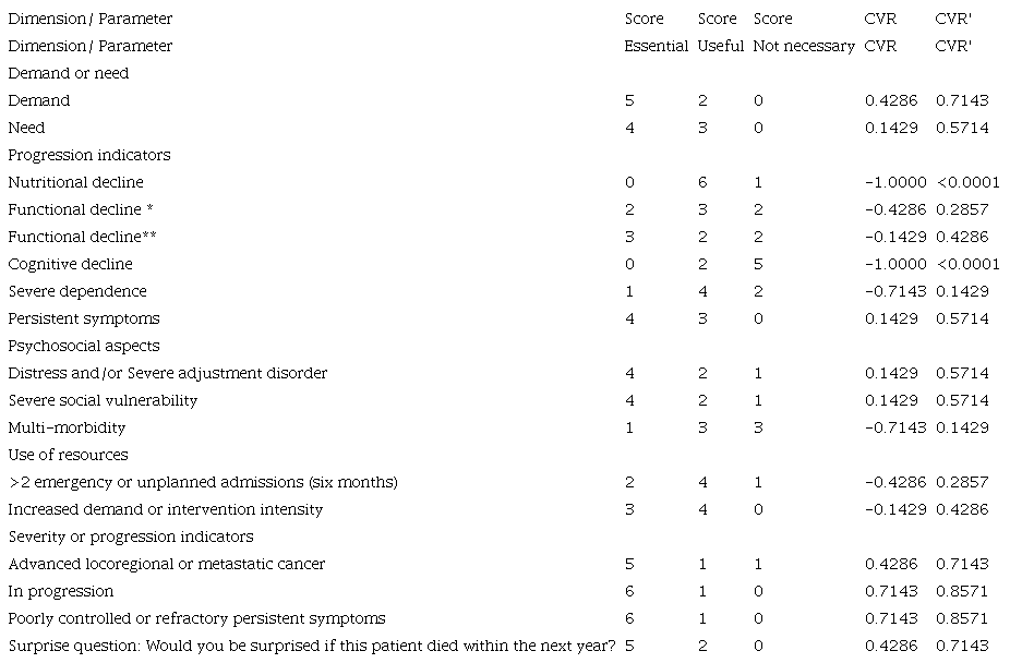 The results show that the Surprise question (SQ) Would you be surprised if this patient died within the next year and the parameters Demand: Has there been any implicit expression or limitation of therapeutic effort or demand for palliative care from the patient, family, or staff members, Oncological disease (Advanced locoregional or metastatic cancer), Oncological disease (in progression (in solid tumors), and Oncological disease (Poorly controlled or refractory persistent symptoms despite optimizing specific treatment), exceed the cut-off point of 0.58, which is why they are considered acceptable according with criteria by Lawshe12) modified by Tristán.13) Moreover, the authors in this study have decided to include in this same category the parameters of Need: identified by professional staff members, Symptoms checklist (ESAS) ≥ 2 persistent or refractory symptoms, EDD > 9, Family and social assessment given that, although they all scored at 0.5714, their value is very close to the cut-off point.
