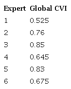Table 3 evidences that the CVI by expert is adequate because it exceeds the cut-off point defined by the Lawshe model,12 modified by Tristán,13 that is CVI > 0.58.